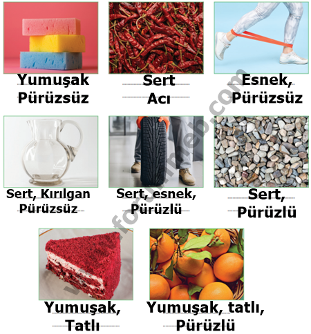 1. Aşağıdaki görselleri inceleyiniz. Görsellerin altına varlıkların özelliklerini yazınız (sert, yumuşak, pürüzlü, esnek, kırılgan, tatlı, acı, ekşi gibi). (Bazı görseller, birden fazla özelliğe sahip olabilir.)