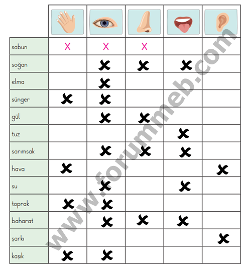 3. Aşağıda verilen maddeleri hangi duyu organlarıyla algıladığınızı örnekteki gibi işaretleyiniz.