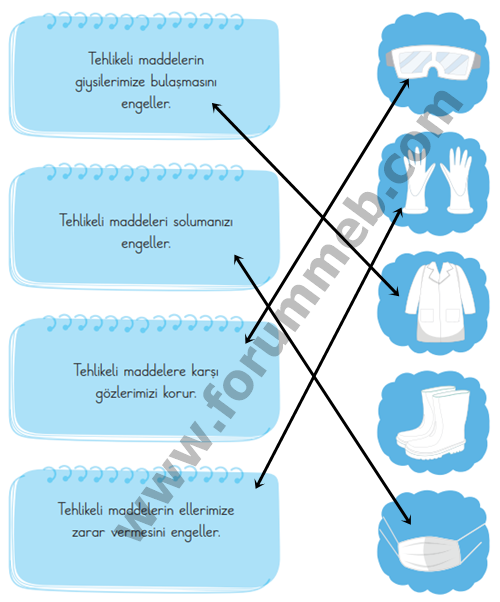 6. Sağlığımız için tehlikeli olan maddelerle çalışırken kullanmamız gereken koruyucu ekipmanlarla ilgili açıklamaları okuyunuz. Verilen görselleri uygun açıklama ile eşleştiriniz.