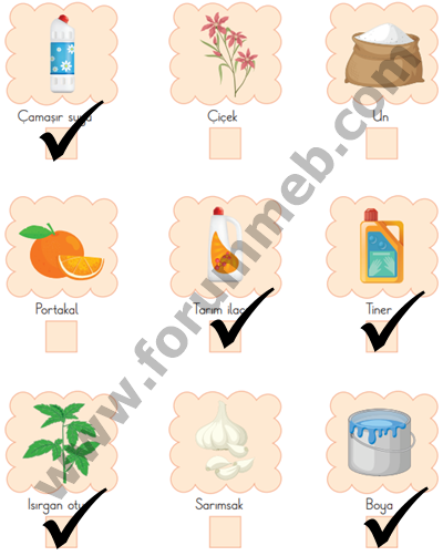 8. Bazı maddelere dokunmak, onları tatmak veya koklamak canlı vücuduna zarar verebilir. Aşağıdakilerden hangisi bu maddelere örnektir? İşaretleyiniz.
