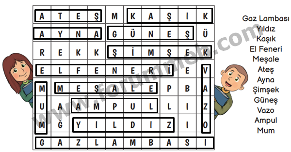 2. Zeynep ve Cemil, ışık kaynakları ile ilgili bir bulmaca hazırlıyorlar. Bulmacadaki ışık kaynaklarını ve ışık kaynağı olmayan varlıkları bulunuz. Tablodaki ilgili bölümün altına yazınız. Kalan harfleri kutulara sıra ile yazarak doğal ışık kaynağı olan canlının adını bulunuz.