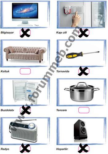 4. Aşağıda verilen görsellerde mıknatısların kullanıldığı alet ve eşyaların altındaki kutucukları “X” ile işaretleyiniz.