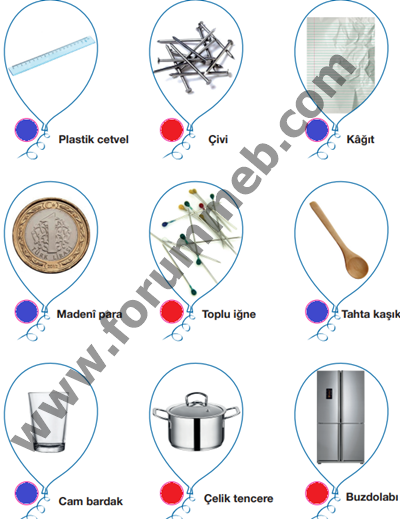 1. Aşağıda balonların içinde verilen maddeleri inceleyiniz. Bunlardan mıknatıs tarafından çekilenleri kırmızıya, çekilmeyenleri maviye boyayınız.