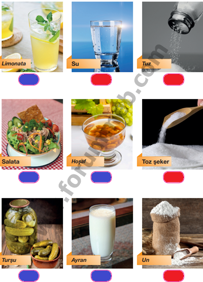 1. Aşağıda verilen görsellerden saf madde olanların altındaki kutucuğu kırmızıya, karışım olanların altındaki kutucuğu ise maviye boyayınız.