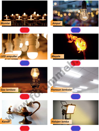 1. Aşağıda verilen aydınlatma araçlarını inceleyiniz. Bu araçlardan günümüzde kullanılanların altındaki kutucuğu maviye, geçmişte kullanılanların altındaki kutucuğu ise kırmızıya boyayınız.