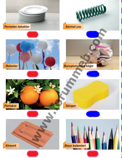 2. Aşağıdaki görselleri inceleyiniz. Görsellerdeki cisimlere uygulanan kuvvet ortadan kalktığında eski hâline dönebilen cisimlerin altındaki kutucuğu maviye, eski hâline dönemeyen cisimlerin altındaki kutucuğu kırmızıya boyayınız.