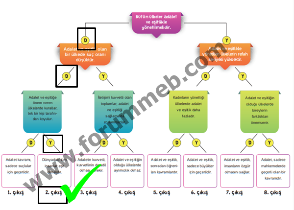 Soru : Aşağıdaki etkinliği inceleyiniz. Doğru olduğunu düşündüğünüz okları takip ederek etkinlik sonunda hangi ifadeye ulaştığınızı işaretleyiniz.