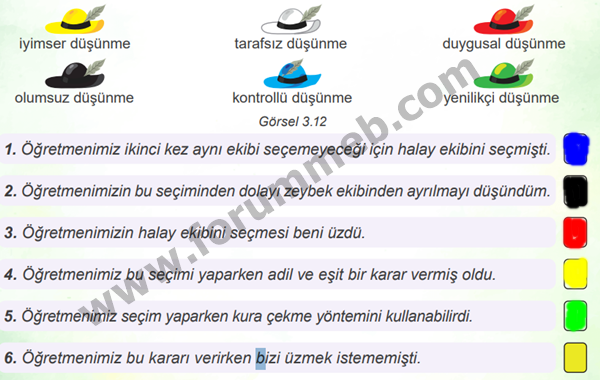 Soru : Öğretmenin halay ekibini seçmesi sonucu zeybek ekibindeki Kemal’in hissettiği duygular, farklı renklerdeki şapkalarla gösterilmiştir. Buna göre Kemal’in duygularını ifade eden şapkaları ilgili görüş ve düşüncelerin rengine boyayarak örnekteki gibi eşleştiriniz. (Beyaz şapkanın kutusu boyanmayacaktır.)
