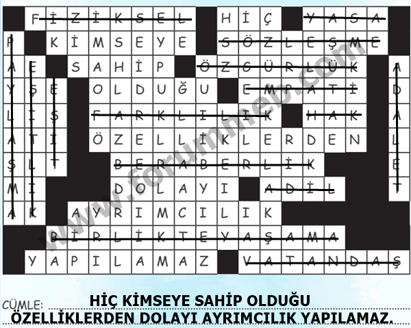 D. Aşağıdaki kelimeleri tablodan bularak işaretleyiniz. Boşta kalan kelimeleri birleştirdiğinizde bulduğunuz cümleyi ilgili alana yazınız.