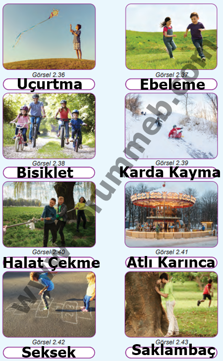 Soru : Aşağıda verilen görselleri inceleyiniz. Görsellerdeki çocuklar, hangi oyunları oynamakta ya da hangi etkinliklere katılmaktadır? Görsellerin altlarında verilen boşluklara yazınız. Bu oyun ve etkinlikleri günümüzde kendi oynadığınız oyun ve yaptığınız etkinliklerle karşılaştırınız. Benzer ve farklı yanlarını söyleyiniz.