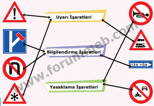 1. Aşağıdaki trafik işaret levhalarını ilgili olduğu başlıkla örnekteki gibi eşleştiriniz.