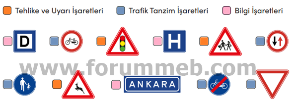 Soru : Trafik işaret levhaları ile ait oldukları trafik işaret grubunu, levhaların yanındaki kutuları boyayarak örnekteki gibi eşleştirelim.