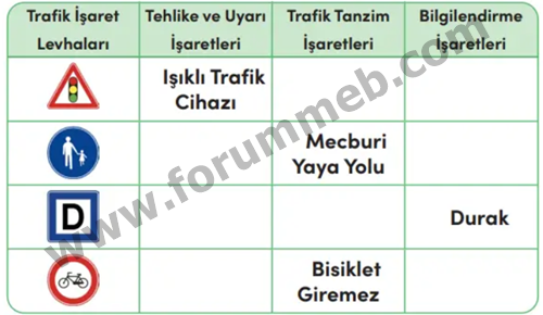 C. Trafik işaret levhalarının anlamlarını ilgili kutuya yazalım.