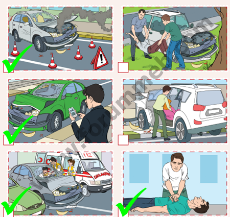 Soru : Aşağıdaki görselleri inceleyelim. İlk yardımda yapılan doğru müdahalenin anlatıldığı görsellerin yanındaki kutucukları işaretleyelim.