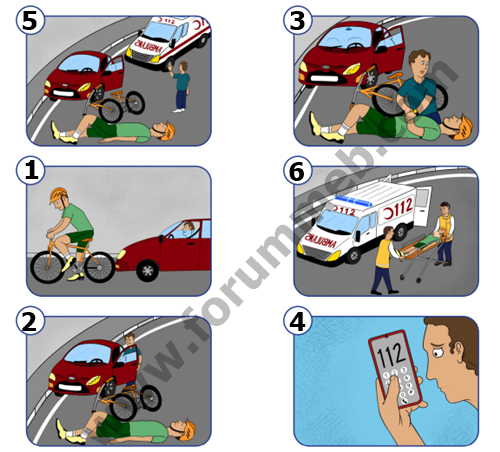 Soru : Görselleri inceleyelim ve görsellerdeki olayları oluş sırasına göre numaralandıralım. İlk yardım uygulanırken yapılan doğru müdahaleleri söyleyelim.