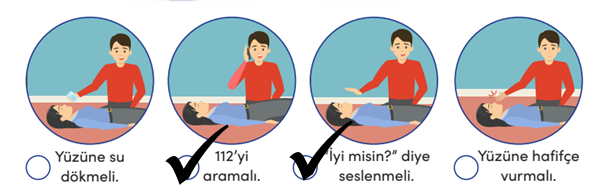 Soru : Mesut Bey, işten eve döndüğünde eşi Semra Hanım’ı yerde baygın hâlde yatarken gördü. Mesut Bey, hangi ilk yardım uygulamalarını yaparsa Semra Hanım’a doğru müdahale yapmış olur? Görselleri inceleyerek doğru seçenekleri işaretleyelim.