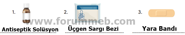 A. Görsellerde verilen ilk yardım malzemelerinin isimlerini altlarına yazalım.