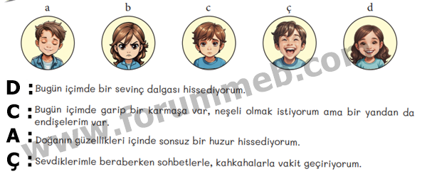 Soru : Aşağıda verilen cümlelerle duygu durumunu ifade eden görselleri eşleştiriniz. Boşta kalan görselle ilgili siz de bir cümle yazınız.