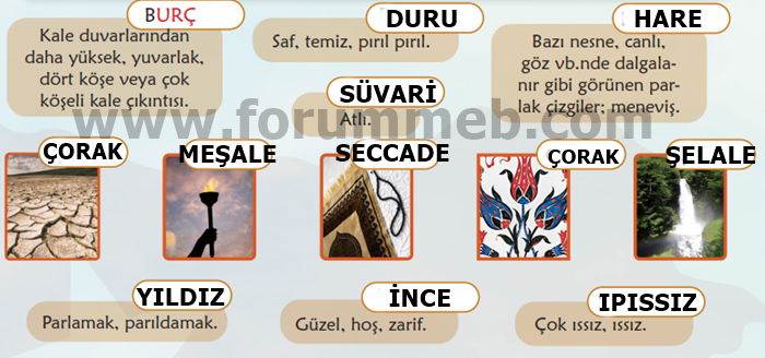 Soru : b. Şiirde yer alan bazı kelime/kelime gruplarının anlam ya da görselleri aşağıda verilmiştir. Baş harflerden yararlanarak bu kelime/kelime gruplarını bulunuz ve örnekteki gibi yazınız.