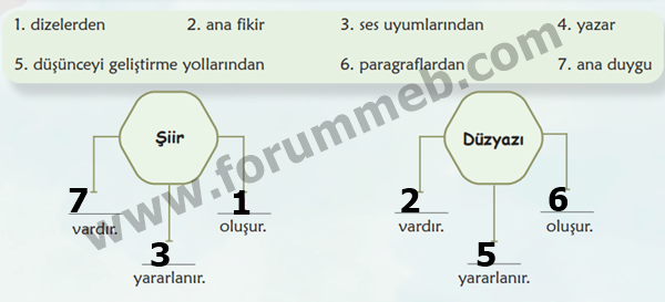 Soru : b. Öğrendiklerinizden hareketle şiiri düzyazıdan ayıran unsurlar neler olabilir? Tartışınız ve aşağıdaki numaralandırılmış ifadelerden uygun olanları kavram haritasına yerleştiriniz.